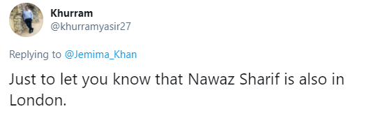 ایک ٹوئٹر صارف خرم نے ازراہ مذاق کہا کہ ’آپ کی اطلاع کے لیے عرض ہے کہ نواز شریف نے لندن میں ہیں۔‘